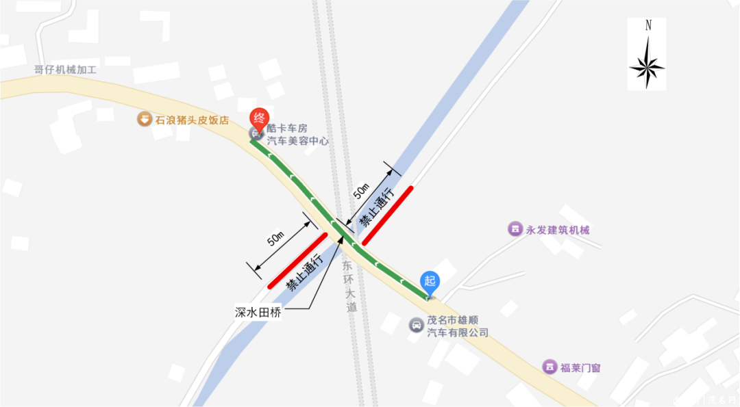 国谈G325线K407+509m羊角镇深水田桥往西方针100米至库卡车房汽车好意思容中心,往东方针100米至茂名市雄顺汽车商行界限;大塘边至深水田桥50米界限;深水田路口至国谈325路口50米界限。