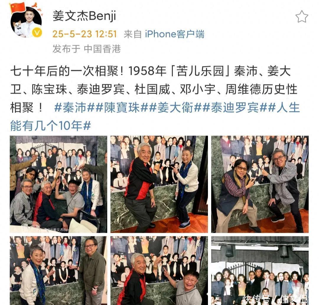 5 月 23 日,秦沛之子姜文杰于个东说念主酬酢账号共享了一组约会的像片,同期配文说念:1958 年《苦儿乐土》中秦沛、姜大卫、陈宝珠、泰迪罗宾、杜国威、邓小宇、周维德达成了历史性的汇聚。