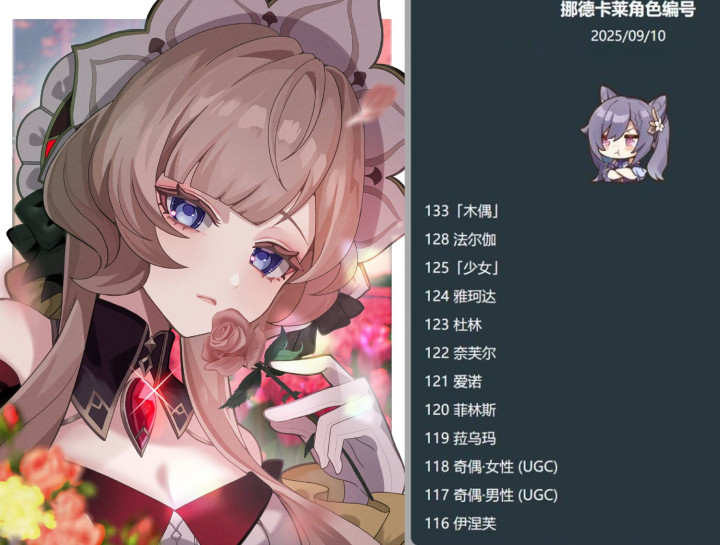 同期,关连后续新扮装的编号也出来了,杜林和雅珂达是在青娥之前,6.1b剧诗火冰风目测可以对上。尚缺126,127两个扮装,以及木偶之前的129-132的四个扮装。