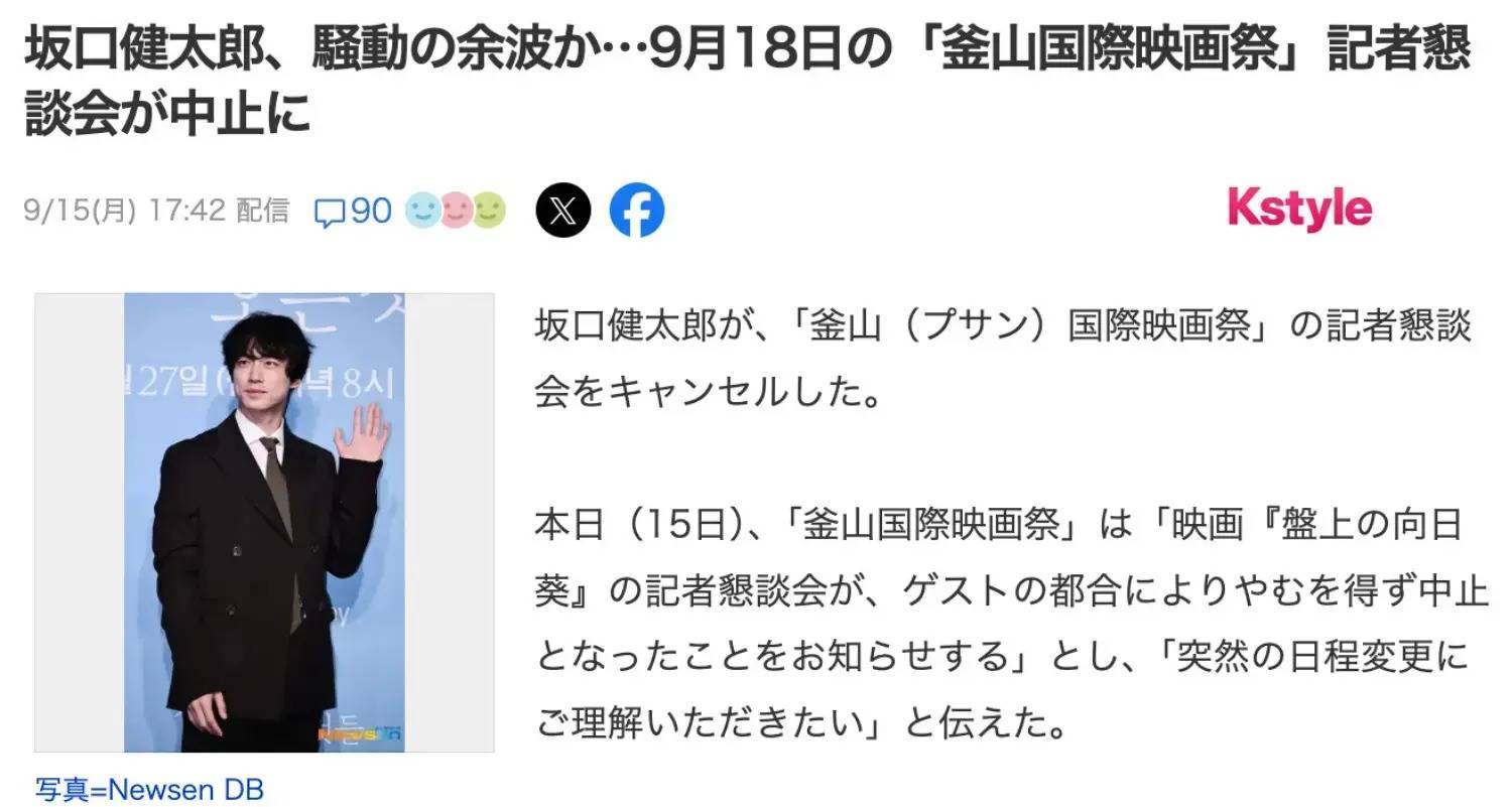 9月16日,据日媒报说念,受到“三角恋”风云影响坂口健太郎原定于本周四投入的釜山海外电影节记者恳谈会取消。