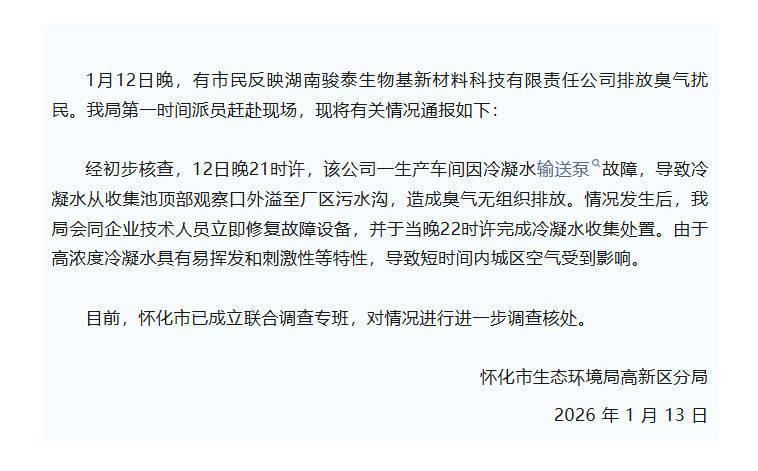 1月13日,怀化市生态环境局高新分袂局发布情况通报称,1月12日晚,有市民反应湖南骏泰生物基新材料科技有限牵累公司排放臭气扰民。经初步核查,12日晚9时许,该公司一世产车间因冷凝水运送泵故障,导致冷凝水从网罗池顶部不雅察口外溢至厂区浑水沟,形成臭气无组织排放。情况发生后,该局会同企业时候东谈主员立即设立故障勾引,并于当晚10时许完成冷凝水网罗处置。由于高浓度冷凝水具有易蒸发和刺激性等特点,导致短时候内城区空气受到影响。现在,怀化市已竖立聚合看望专班,对情况进行进一步看望核处。